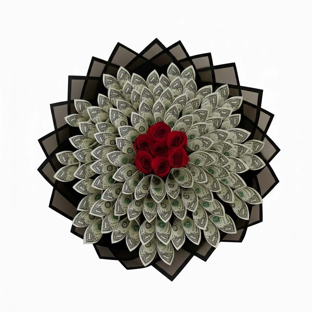 A luxurious money bouquet featuring a minimum of 50 U.S. dollar bills, artfully arranged for a bold and elegant presentation. Each bouquet is custom-designed based on preference, with options for color theme, wrapping style, and accents making it a distinctive and memorable gift for any special occasion.